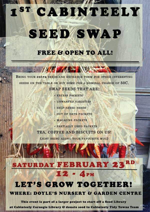 Cabinteely’s first annual seed swap takes place at Doyles Nursery, Brennanstown Rd, Cabinteely 12 – 4pm Saturday 23rd February.@@