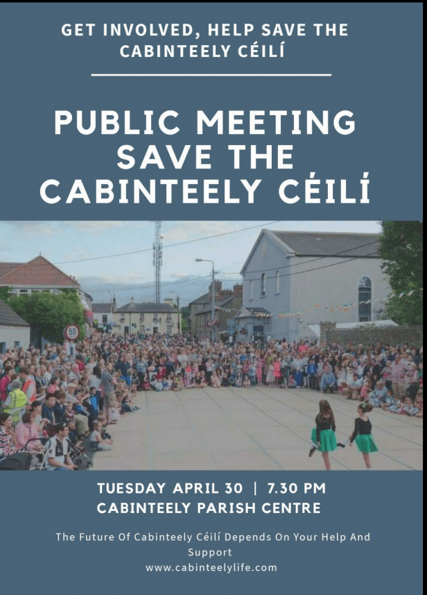 The Cabinteely Céilí committee is holding a public meeting on Tuesday 30th April at 7.30pm to discuss the future of the Ceilí.