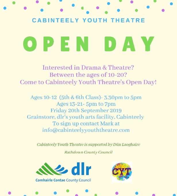 Cabinteely Youth Theatre Open Day 2019 takes place on 20th September. New members are always welcome. This year they have announced a younger class for primary school students from 10-12 years old (5th and 6th class). Cabinteely Youth Theatre is located at the Grainstore, Cabinteely Park. Spread the word! Get in contact to book a place at info@cabinteelyyouththeatre.com.