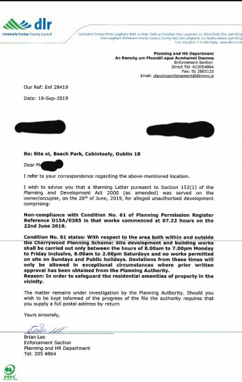 If any other residents note works outside the permitted hours, they should let DLR Planning enforcement know.