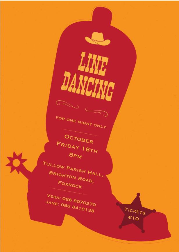 Line Dancing, for one night only, Friday 18th October 8pm, Tullow Church, Foxrock. Tickets just €10. This is a great night out and is very popular. Book your tickets early!