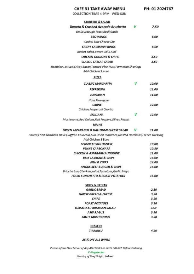 Cafe 31’s Takeaway Menu which they are starting tomorrow (Friday) from 4pm to 9pm.