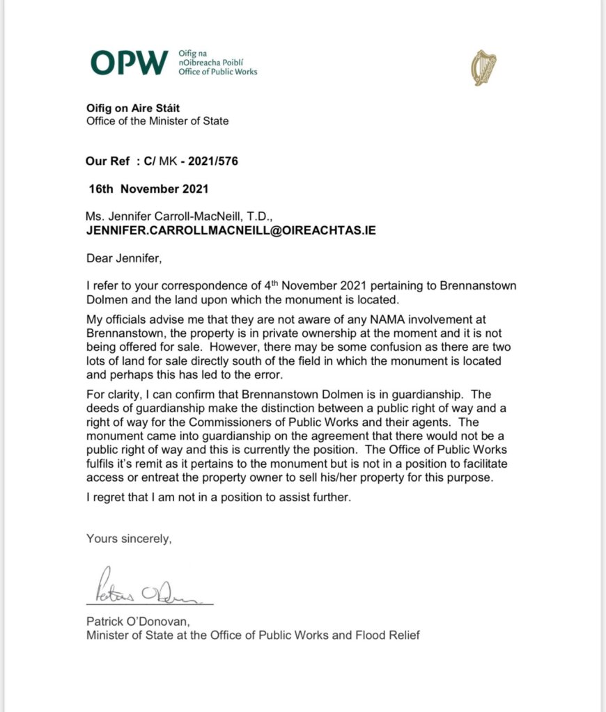 Jennifer Carroll MacNeill TD wrote to the OPW a couple of weeks ago about the dolmen and received the following letter in response.