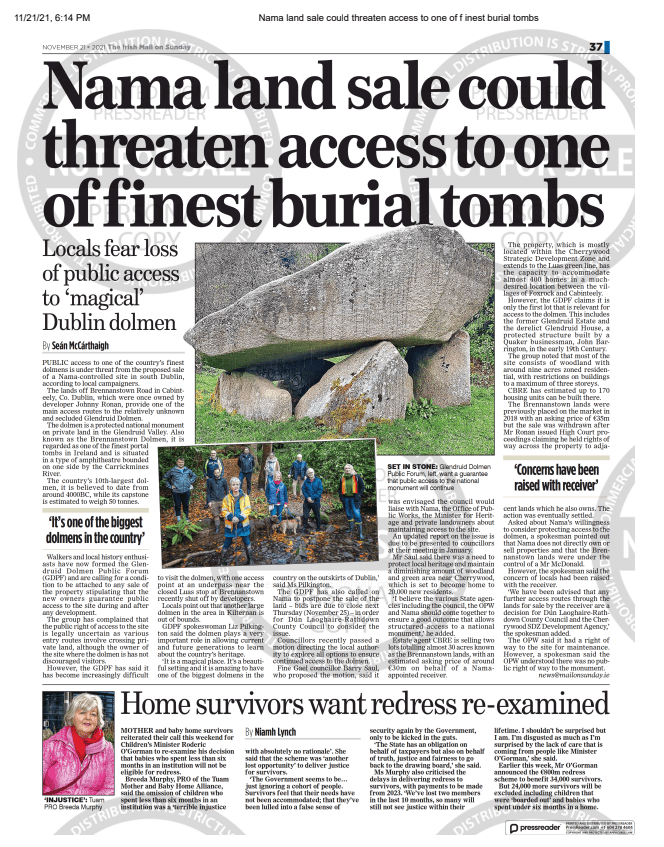 Asked about Nama’s willingness to consider protecting access to the dolmen, a spokesman pointed out that Nama does not directly own or sell properties and that the Brennanstown lands were under the control of a Mr McDonald [Declan McDonald, PWC Receiver appointed by NAMA].
