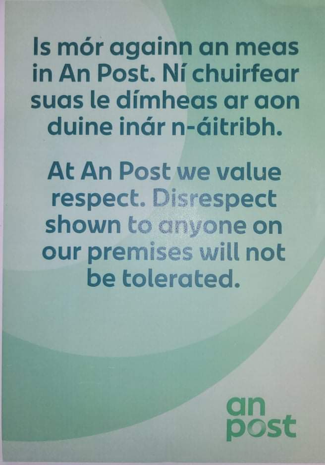 ‘It’s a sad day in the office that this has to be displayed but due to the increase in aggression toward staff it has become a must. While we do understand the frustration of the delay in post these days, verbally attacking staff in the post office will not resolve this. Going forward any abuse or aggression towards any staff member will no longer be tolerated.’