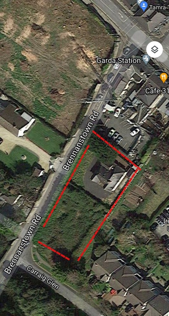 Permission for development consisting of the construction of 4 no. new three storey (2 floors plus attic) semi-detached dwelling houses each comprising 4 bedrooms plus home office, removal of existing boundary wall to provide new public pedestrian footpath along Brennanstown Rd, 2 no. new vehicular accesses off Brennanstown Road with surface car parking, new front boundary treatment along Brennanstown Road, & all associated works including landscaping, new drainage connections, boundaries works, ect. Works to include removal of existing boundary and entrance way to existing dwelling and construction of new boundary and relocated vehicular entrance way to Brennanstown Rd, for existing dwelling, all located at existing dwelling house & to existing side garden to existing dwelling house.