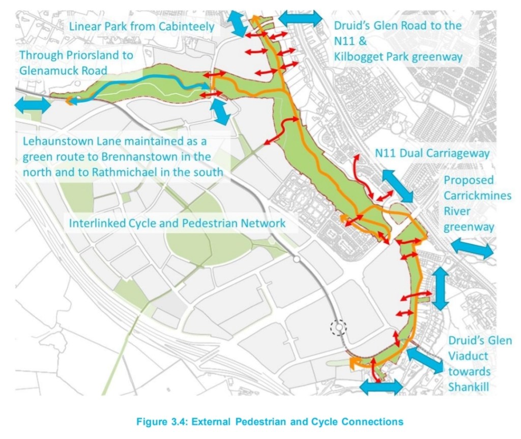 – A north-south greenway of approximate 3.1km long and 4.0m wide, from Cherrywood Business Park to Brennanstown, including connection to Druids Valley and Cherrywood Avenue. Parts of the route are existing and/or were previously permitted (Reg Ref: DZ18A/0854).