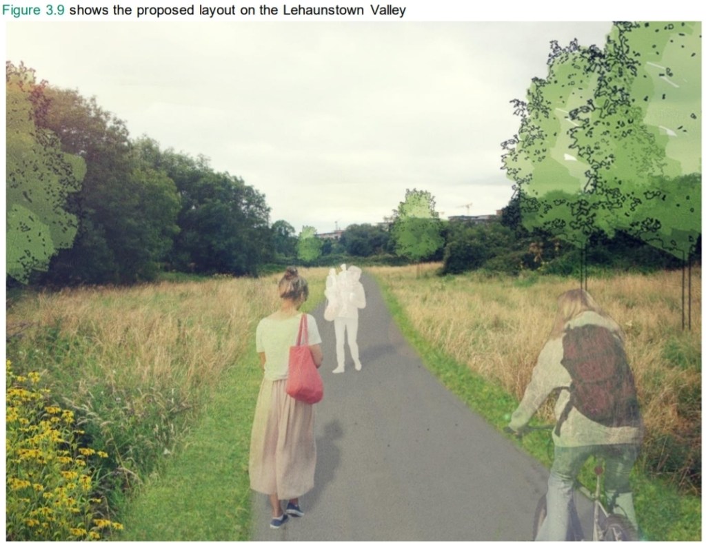 – An east-west greenway of c.420m long and 3.0m wide, from north of the Carrickmines River to Lehaunstown Lane, via a new embankment.