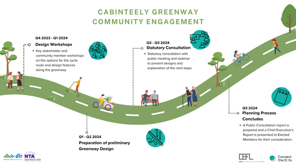 The Cabinteely Greenway involves the creation of a safe, active travel community greenway. This will form part of the DLR Cycle Network, to connect Cornelscourt and Cherrywood. Its goals include: