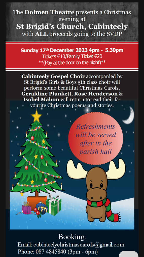 The Dolmen Theatre presents a Christmas evening at St Brigid’s Church, Cabinteely with ALL proceeds going to the St Vincent De Paul